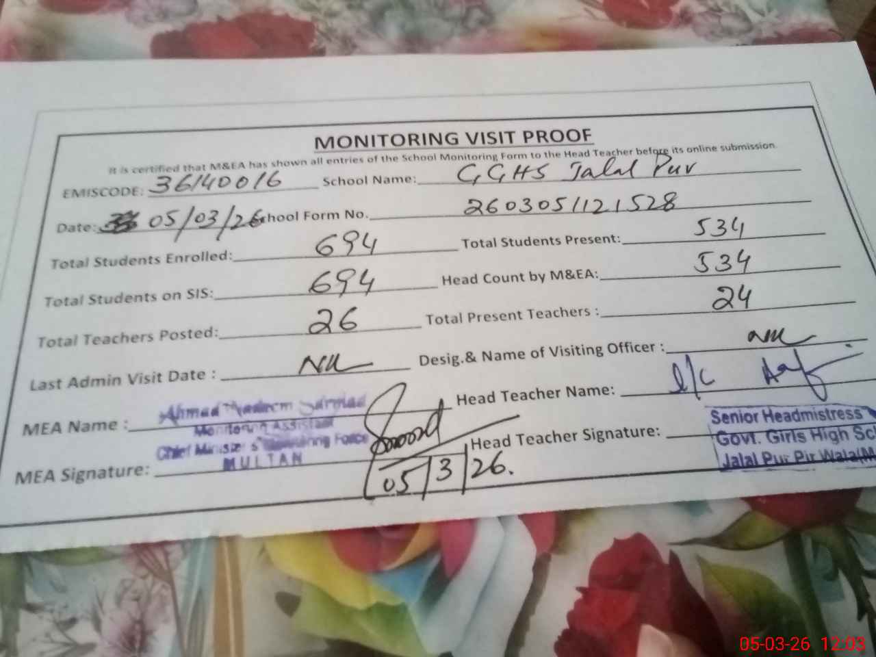 | EMIS Code: 36140016 | Name of School: GGHS JALAL PUR PIRWALA | |||