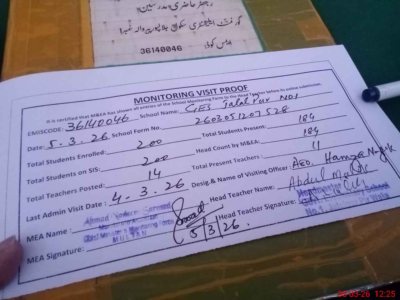 | Attendance Register | Head Teacher | MEA with School | Visit Proof |
