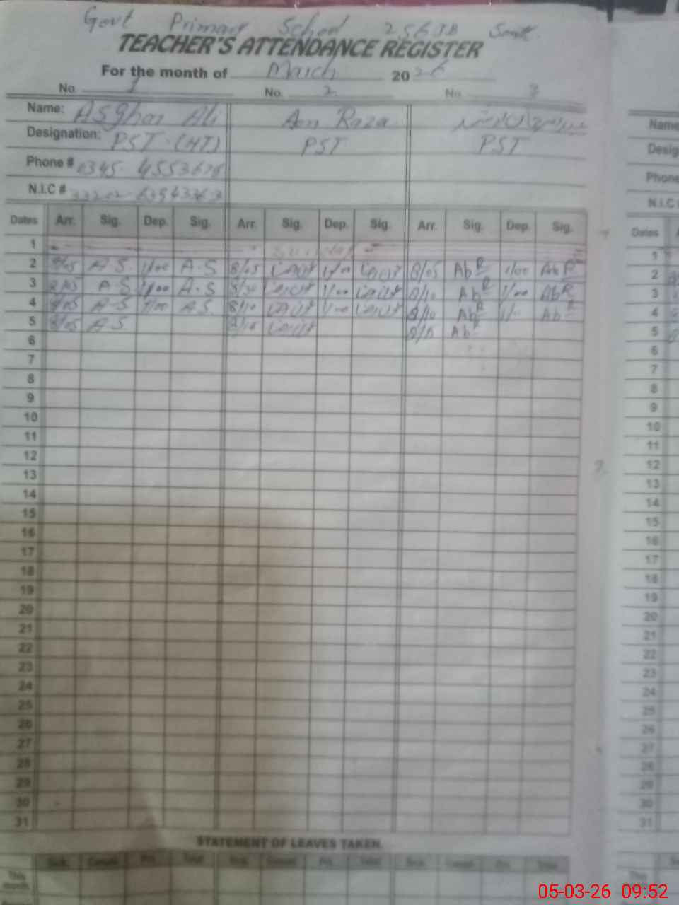 | Name: As**** Al**** Designation: (School Headmaster's/Headmistress's) PST/PTC/JV Phone/Cell Number: 03**** |