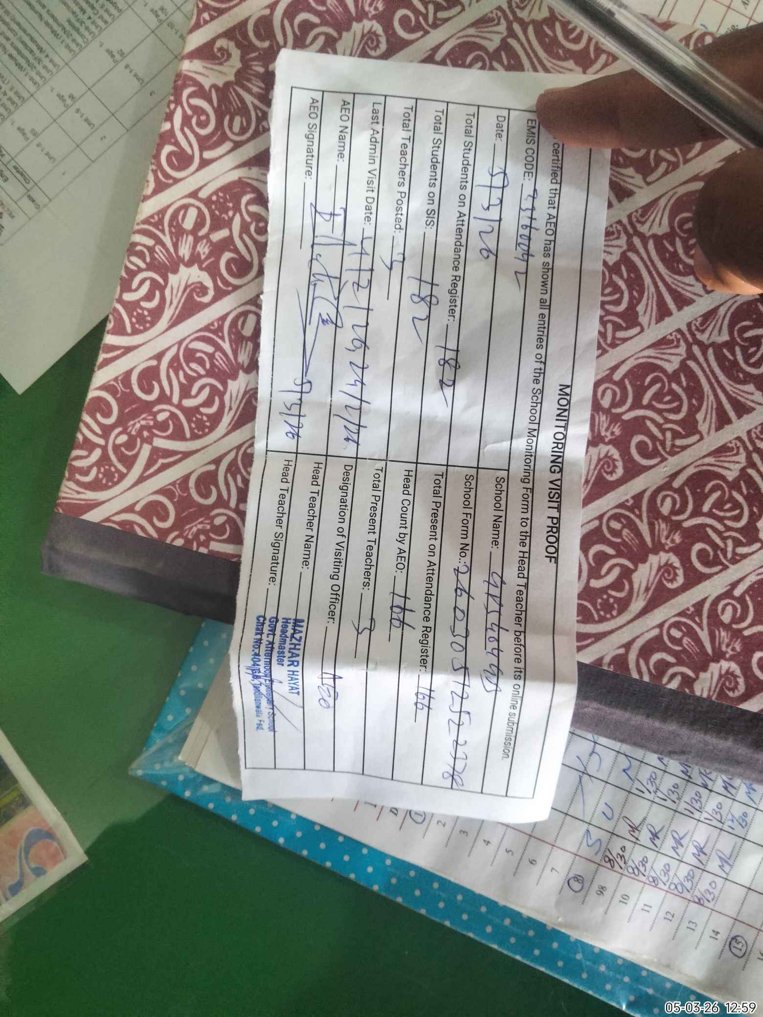 | Attendance Register | Head Teacher | MEA with School | Visit Proof |