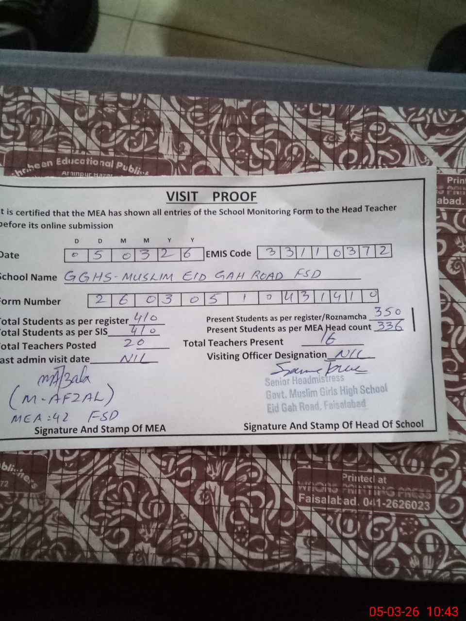 | EMIS Code: 33110372 | Name of School: GGHS MUSLIM, EID GAH ROAD FAISLABAD | |||