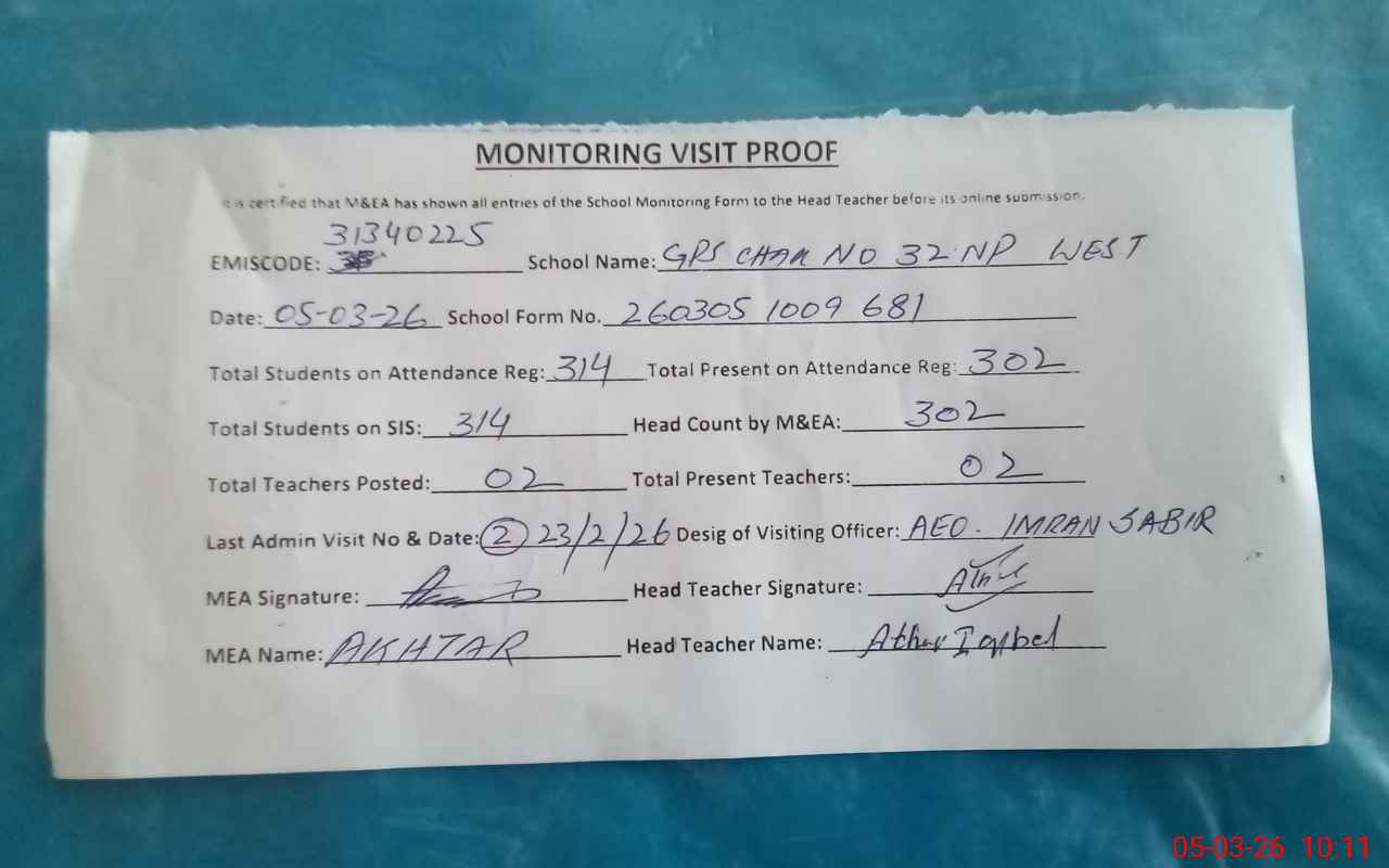 | EMIS Code: 31340225 | Name of School: GPS CHAK NO. 32 WEST | |||