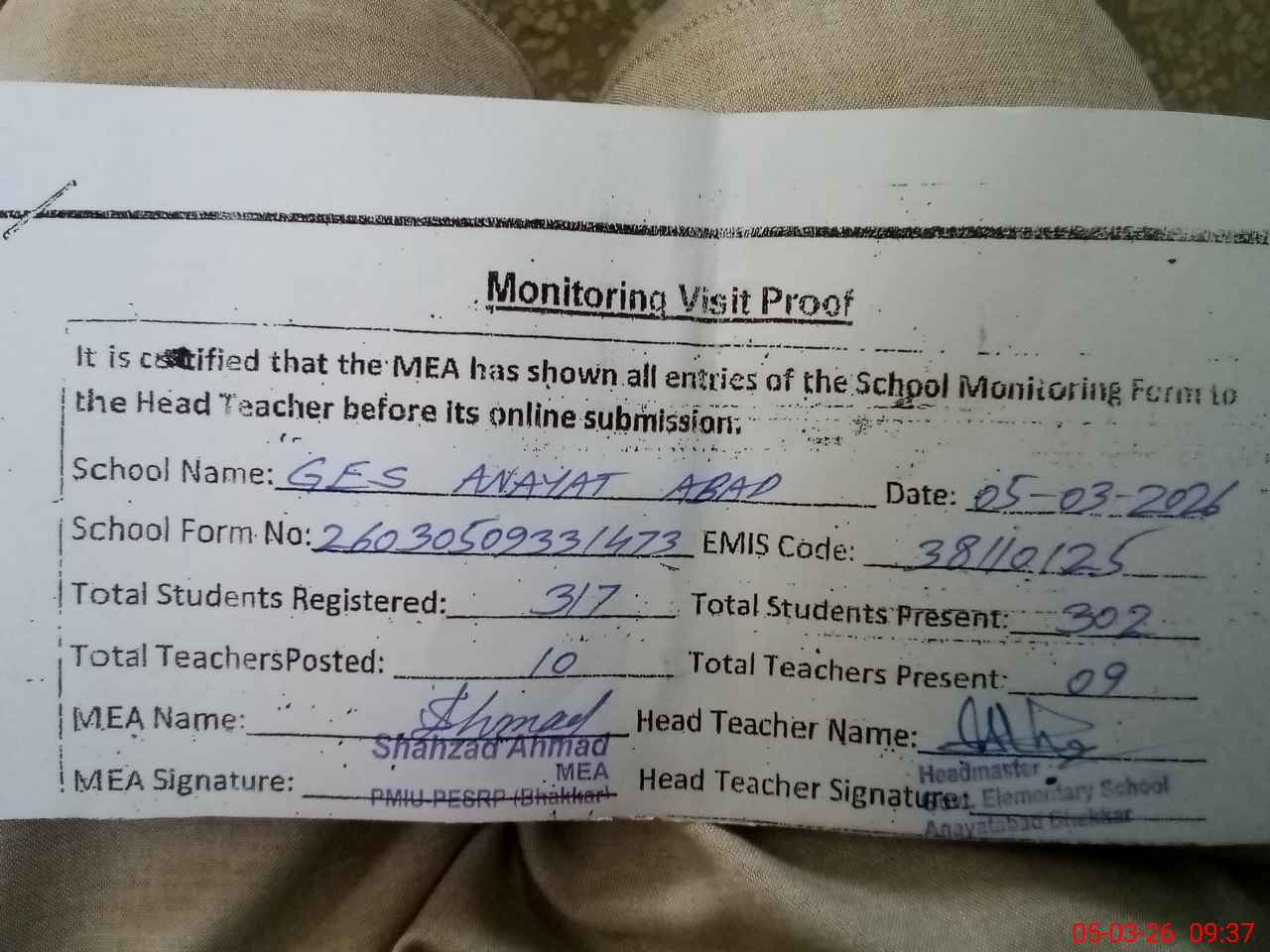 | Name: Mu**** Fa**** Sh**** Designation: (School Headmaster's/Headmistress's) PST Phone/Cell Number: 03**** |