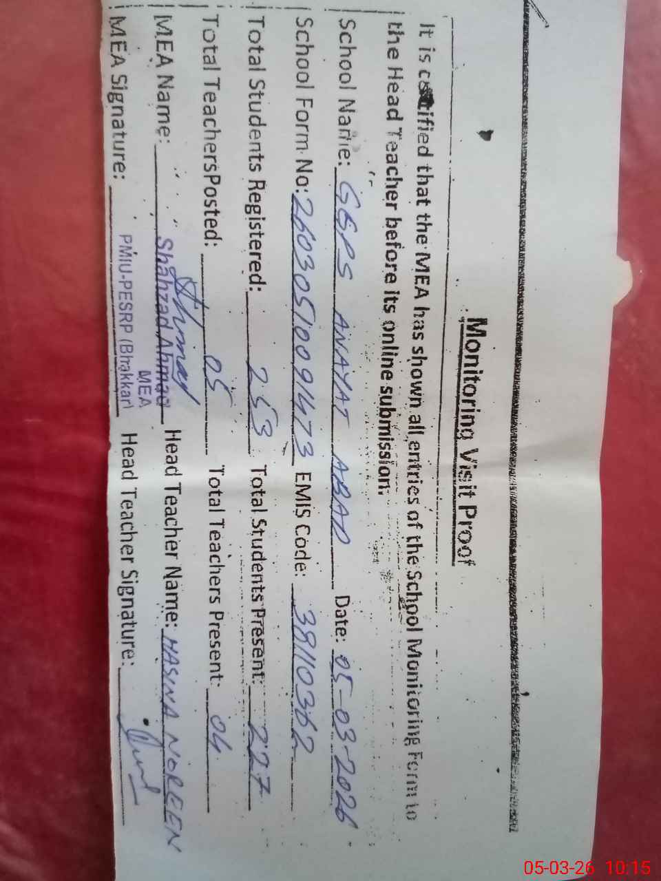 | Attendance Register | Head Teacher | MEA with School | Visit Proof |