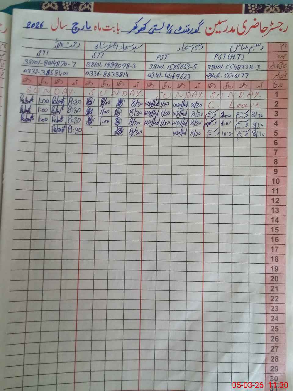 | CNIC | Full Name | Designation | R/C | Absence During Last Calender Month |