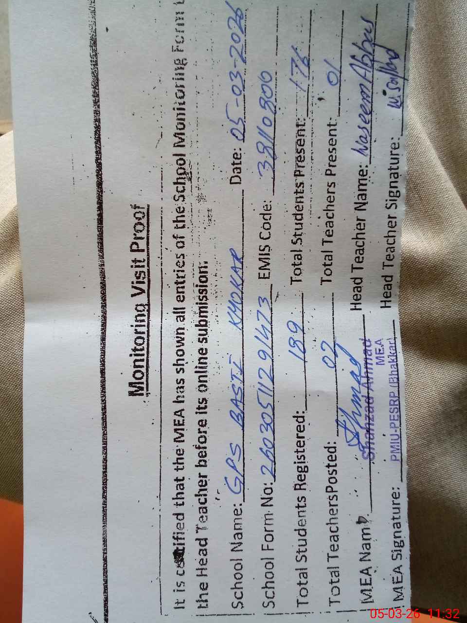 | EMIS Code: 38110800 | Name of School: GPS BASTI KHOKHAR | |||