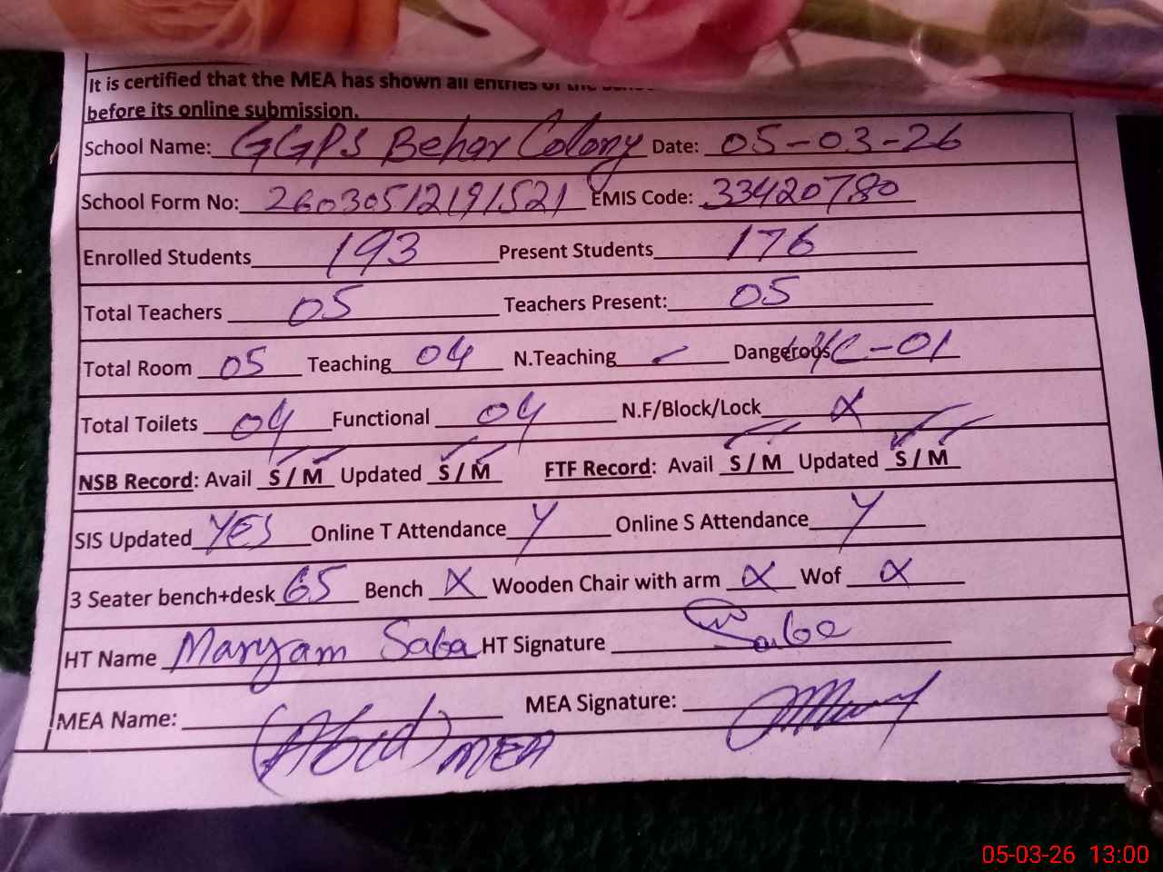 | Certified that this School was Inspected by the Undersigned MEA/DMO Today and the Information Stated Above is as Per Record. | |||||