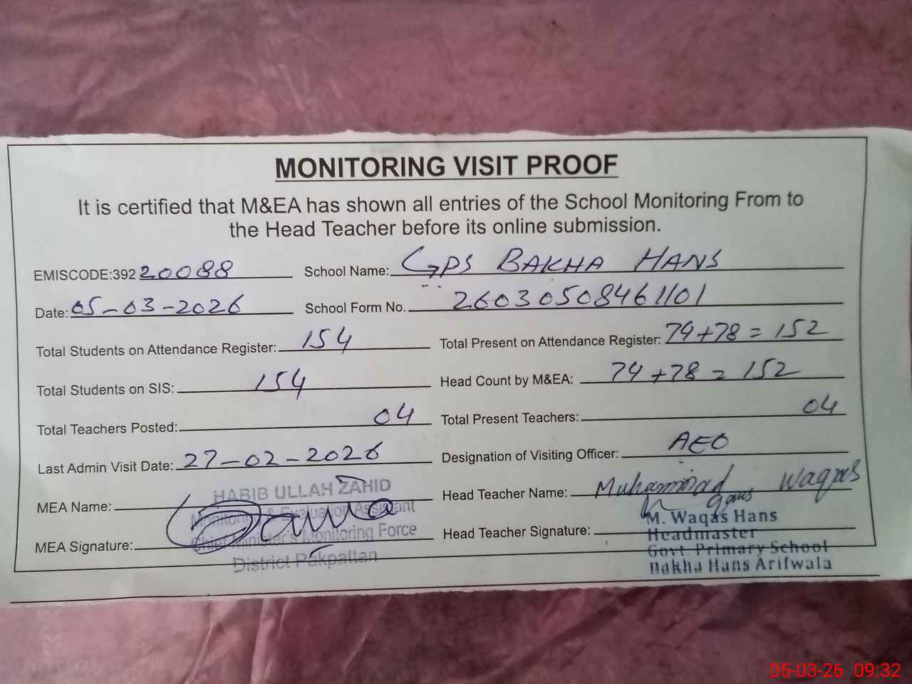 | EMIS Code: 39220088 | Name of School: GPS BAKHA HANS | |||