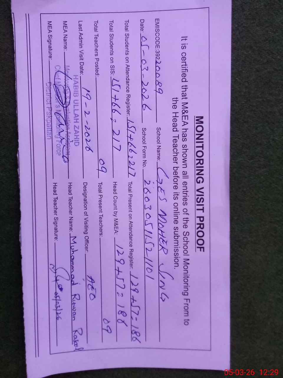 | Certified that this School was Inspected by the Undersigned MEA/DMO Today and the Information Stated Above is as Per Record. | |||||