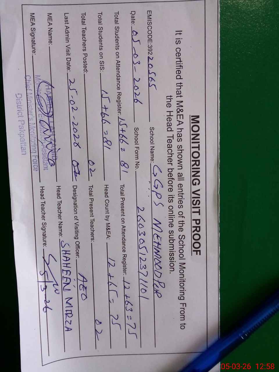 | EMIS Code: 39220565 | Name of School: GGPS MEHMOOD PUR | |||