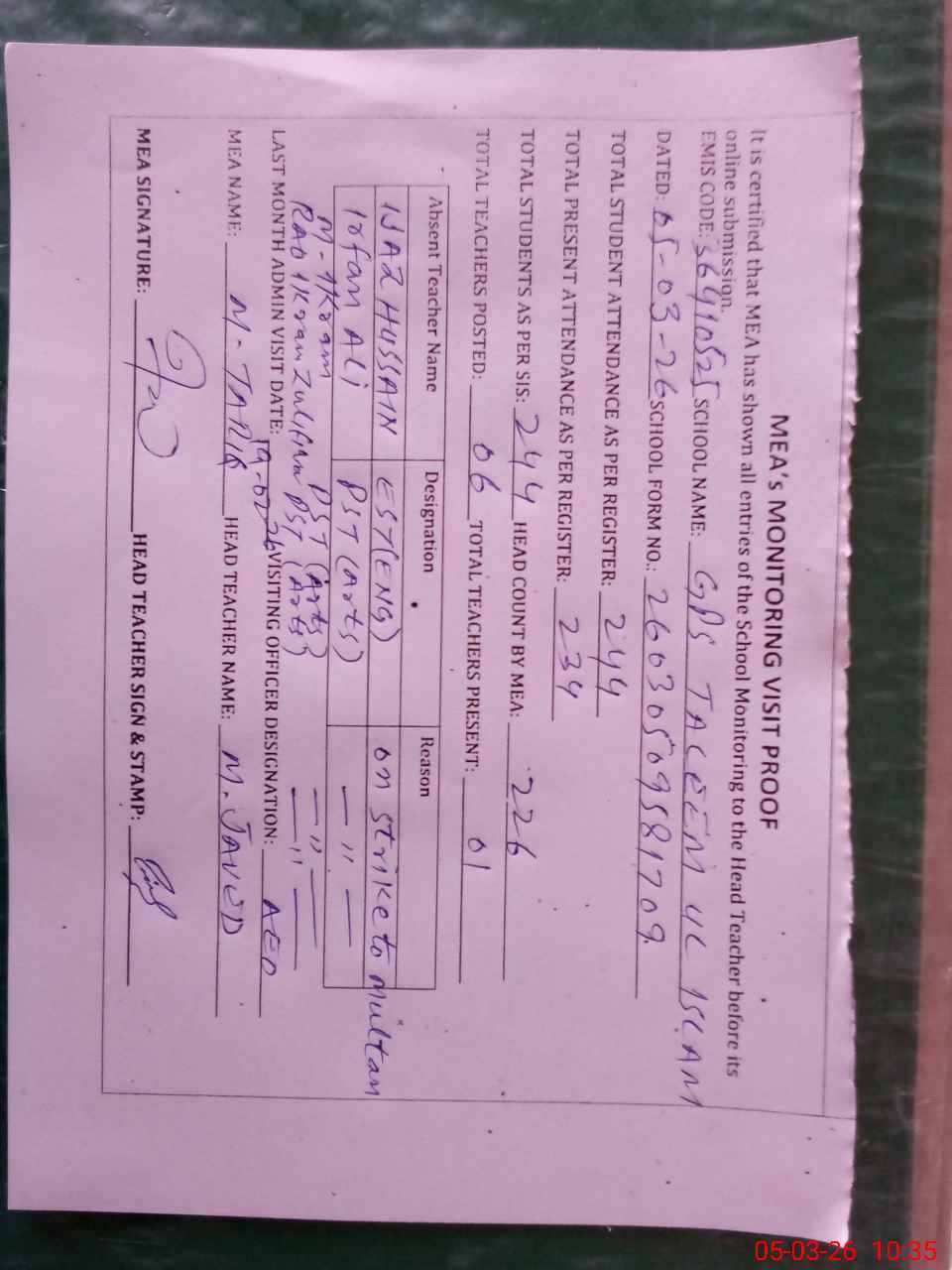 | Remarks (Use Separate Page if Required): 04 Teachers out of 06 went on strike to Multan after marking attendance. | |||||