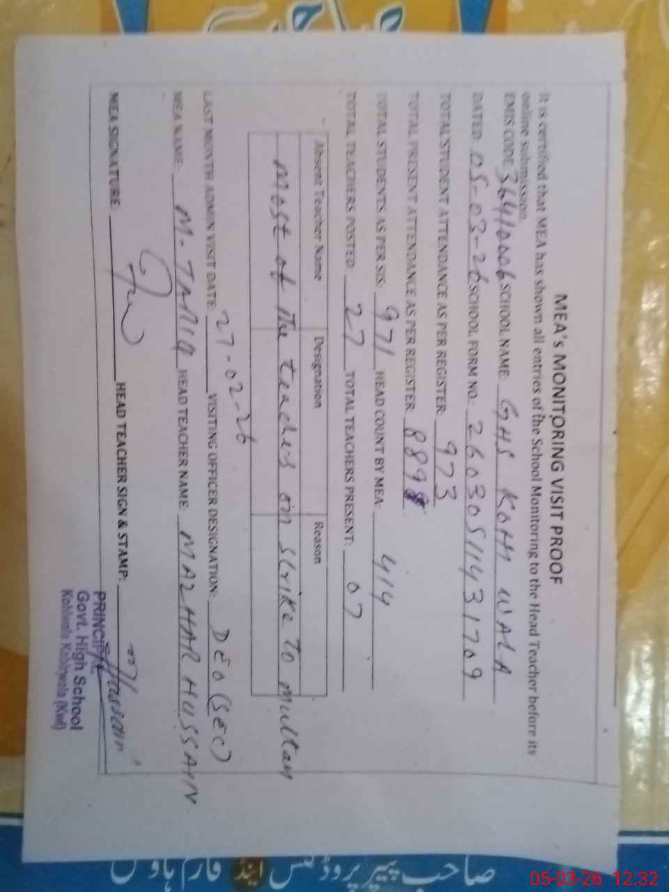 | Attendance Register | Head Teacher | MEA with School | Visit Proof |