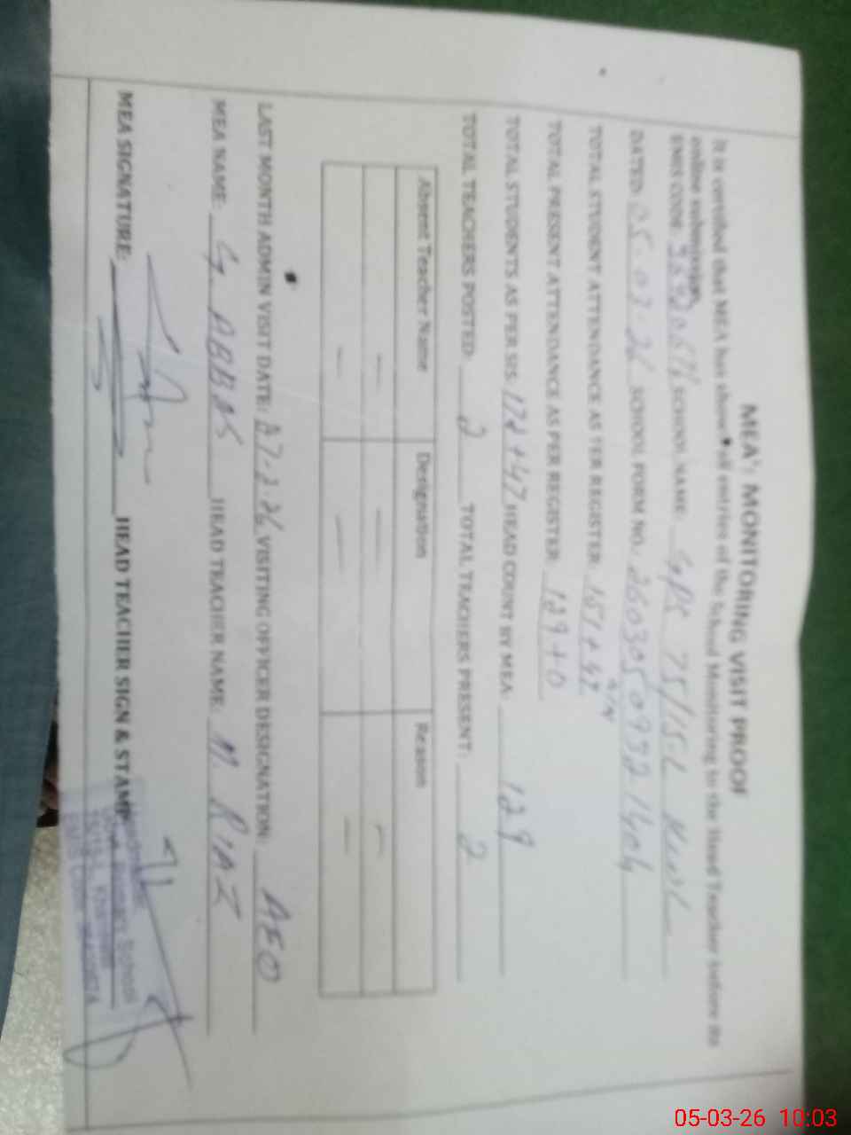 | Remarks (Use Separate Page if Required): in afternoon shift no attandance mark in march 2026 as per roznamcha total students are 173 but as per attandance register total students are 151 | |||||