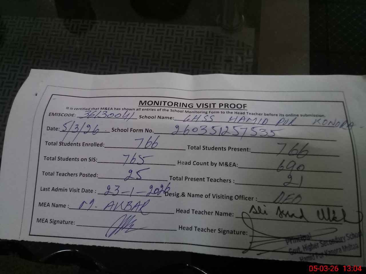 | Attendance Register | Head Teacher | MEA with School | Visit Proof |