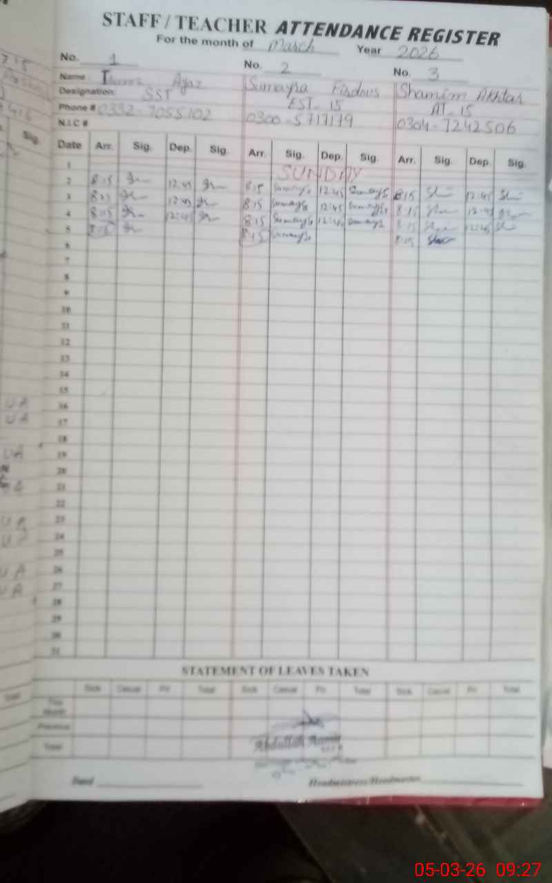 | Name: Ir**** Az Designation: (School Headmaster's/Headmistress's) HEADMISTRESS Phone/Cell Number: 03**** |