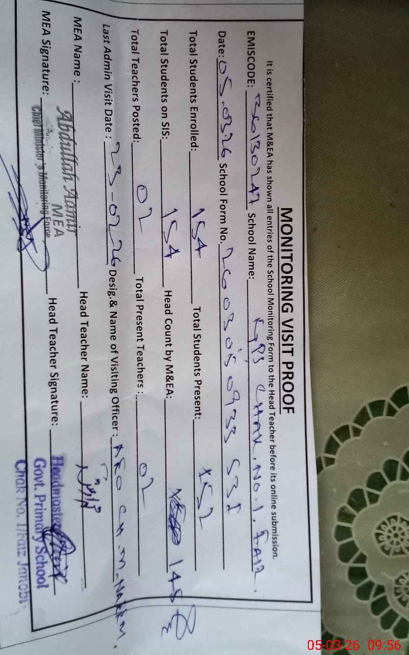 | EMIS Code: 36130247 | Name of School: GPS CHAK NO. 1 FAIZ SOUTH | |||