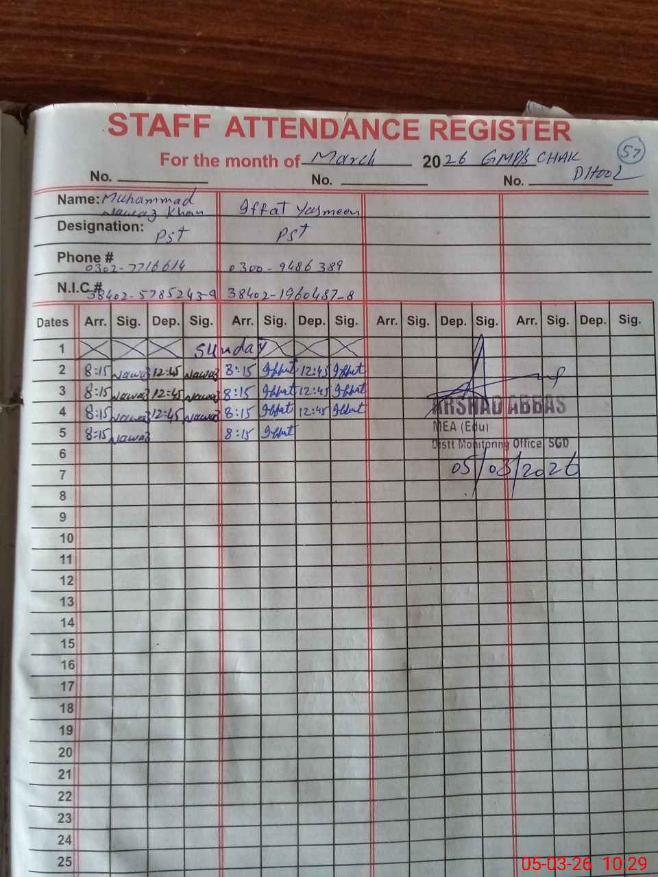 | CNIC | Full Name | Designation | R/C | Absence During Last Calender Month |