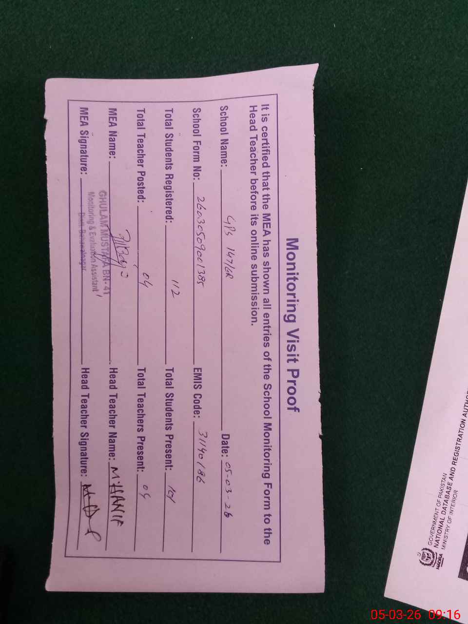 | Attendance Register | Head Teacher | MEA with School | Visit Proof |