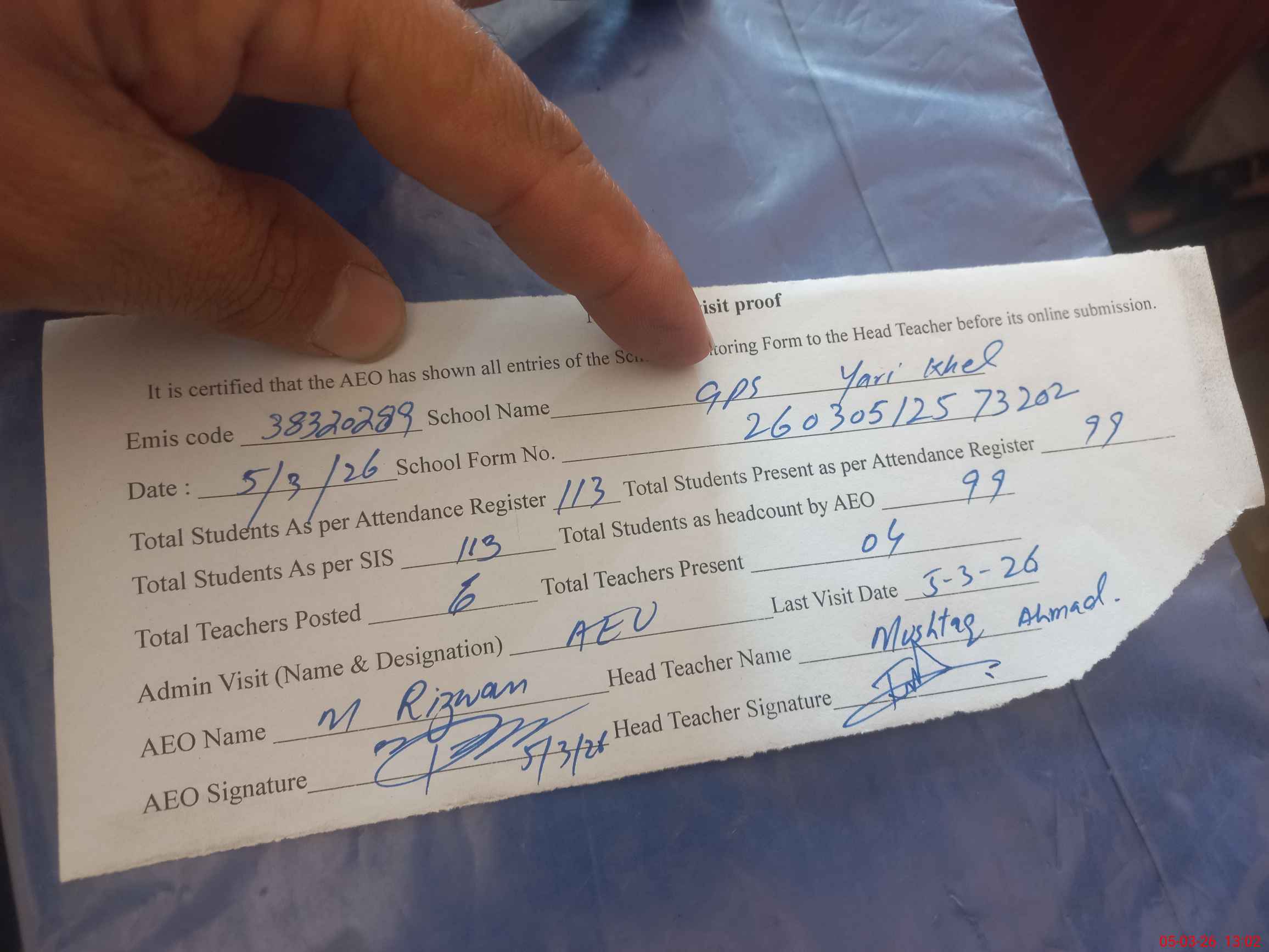 | Attendance Register | Head Teacher | MEA with School | Visit Proof |