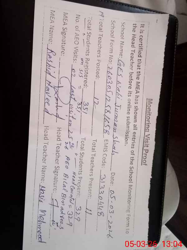| Attendance Register | Head Teacher | MEA with School | Visit Proof |