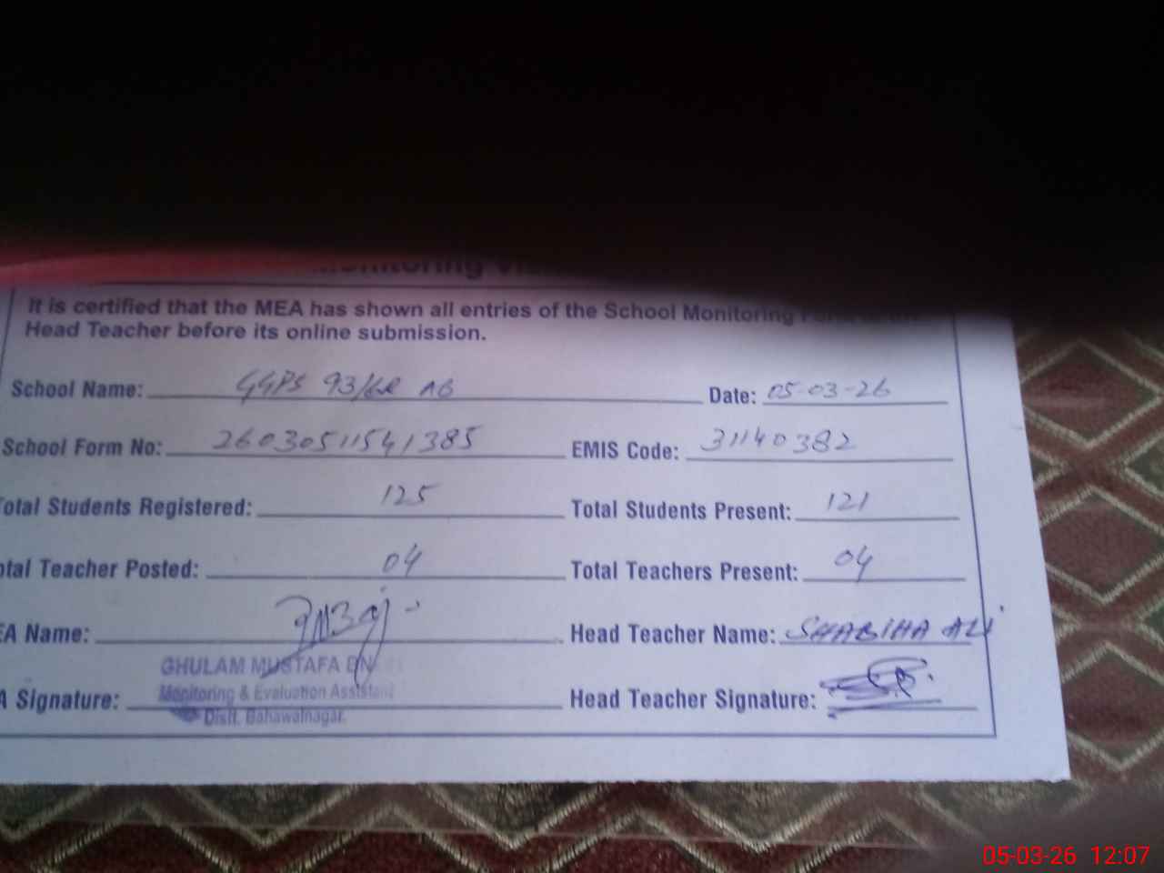 | EMIS Code: 31140382 | Name of School: GGPS 93/6-R AZAFI BASTI | |||