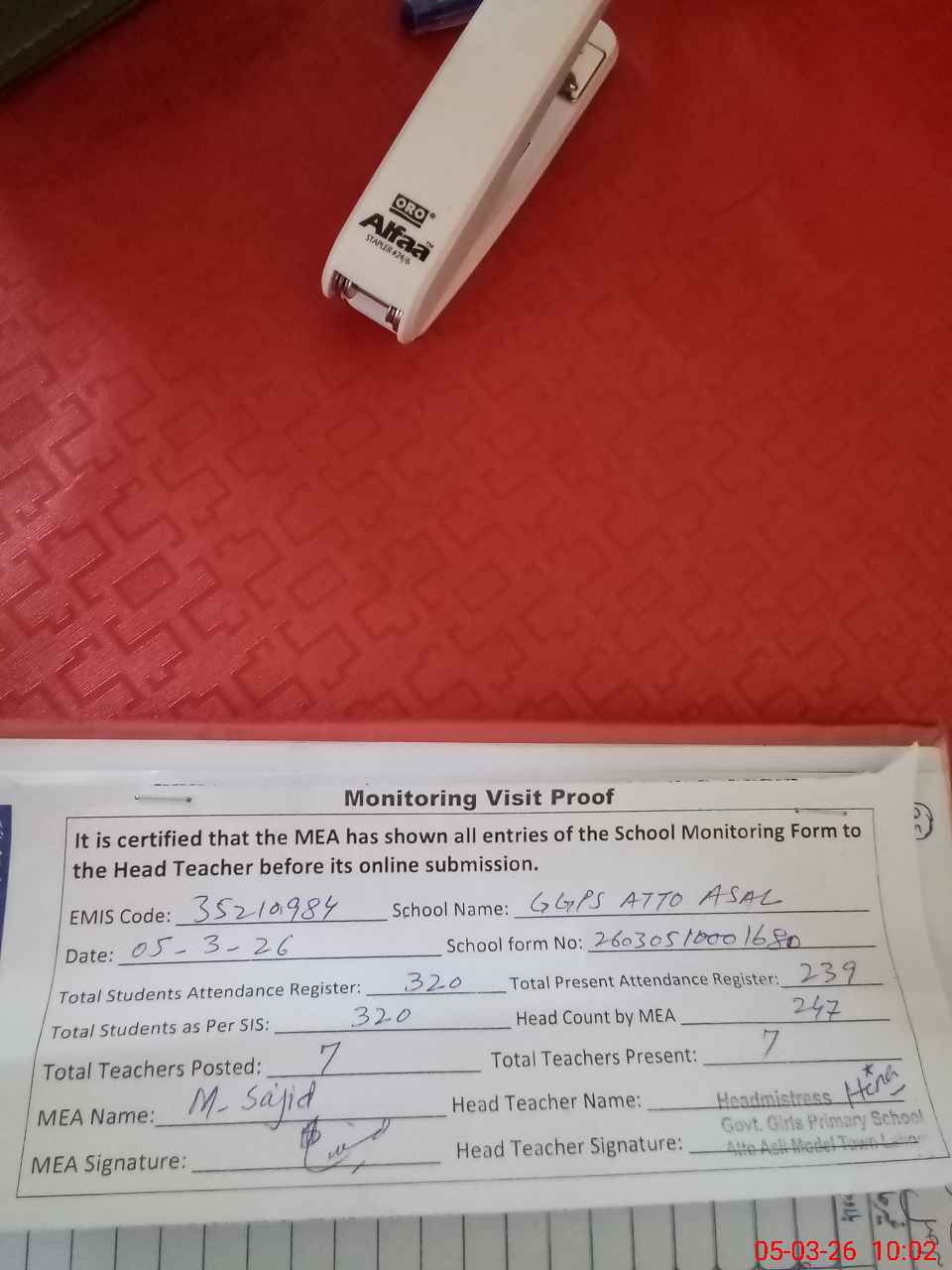 | Attendance Register | Head Teacher | MEA with School | Visit Proof |