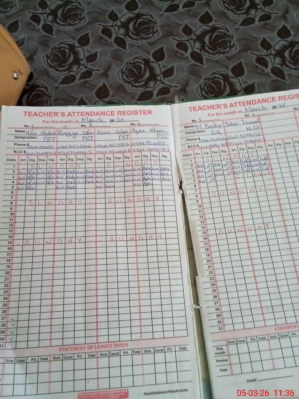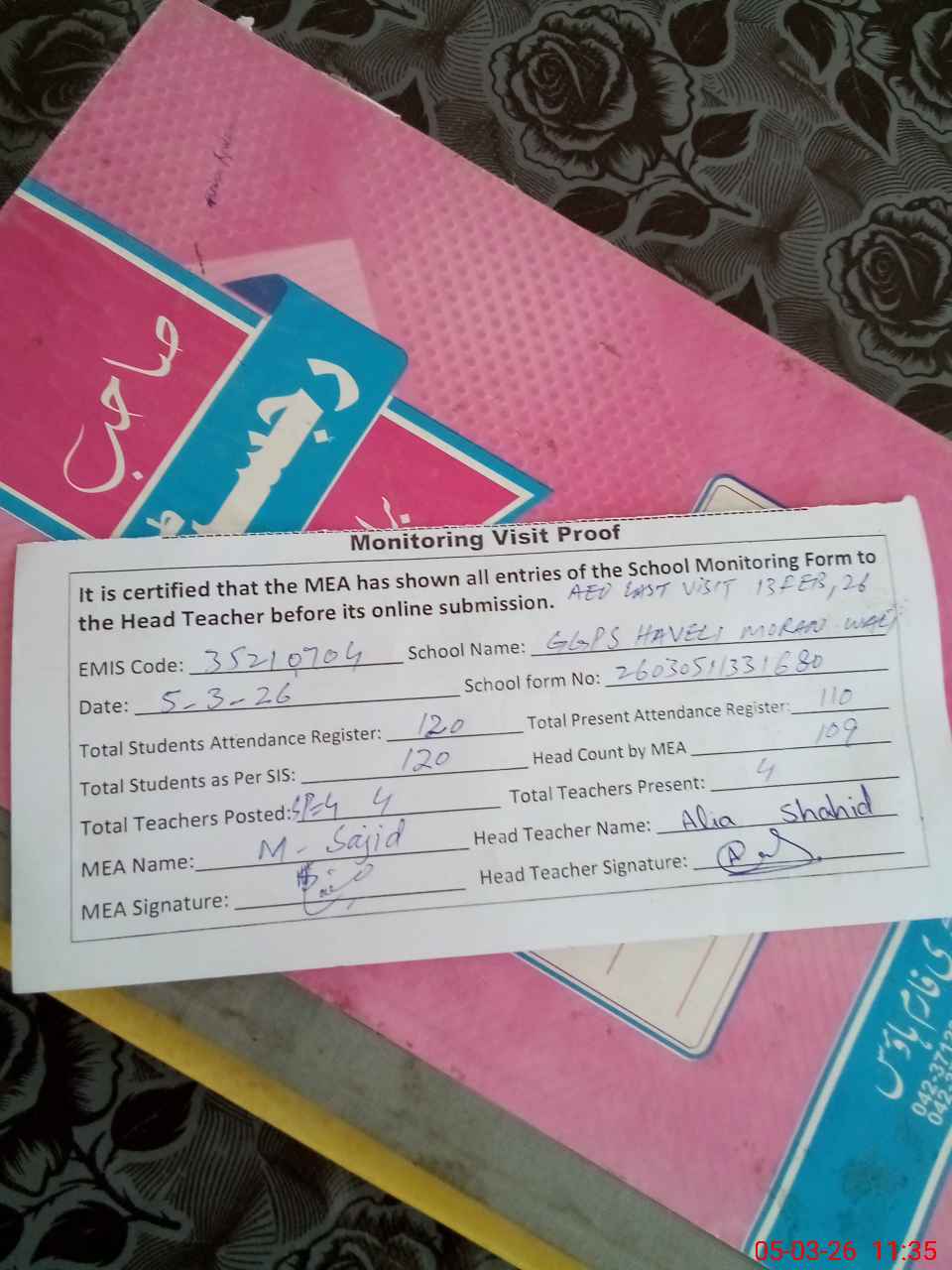 | Remarks (Use Separate Page if Required): Present students percentage is 91 percent Nursery class packed up at 1100 hours and attendance noted from roznamcha whereas attendance register of nursery class is not being maintained after 20 Feb 2026 35210704 | |||||