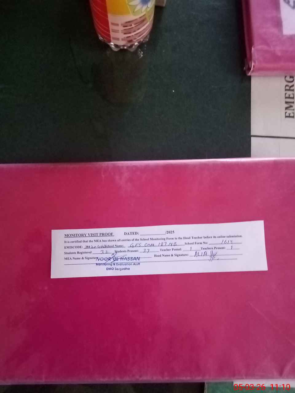| Attendance Register | Head Teacher | MEA with School | Visit Proof |