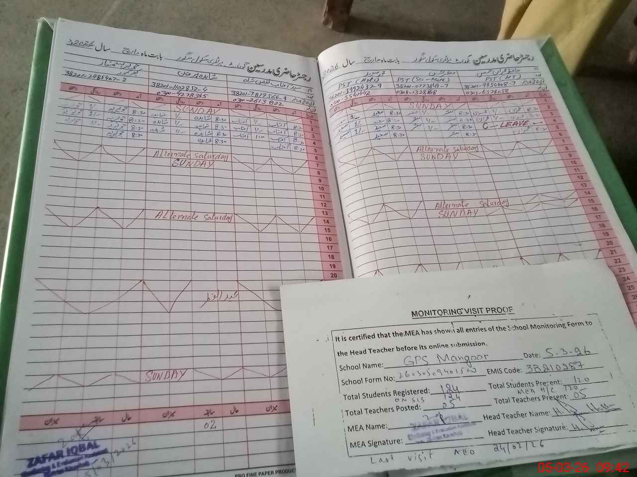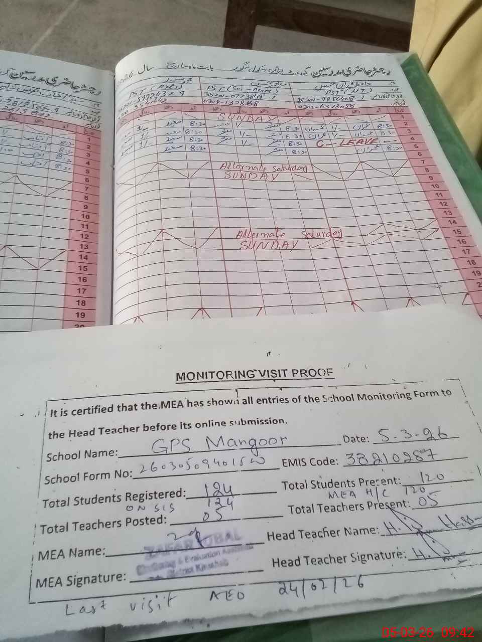 | Attendance Register | Head Teacher | MEA with School | Visit Proof |