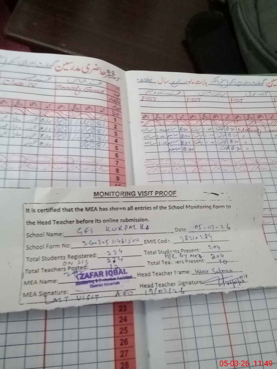 | Attendance Register | Head Teacher | MEA with School | Visit Proof |