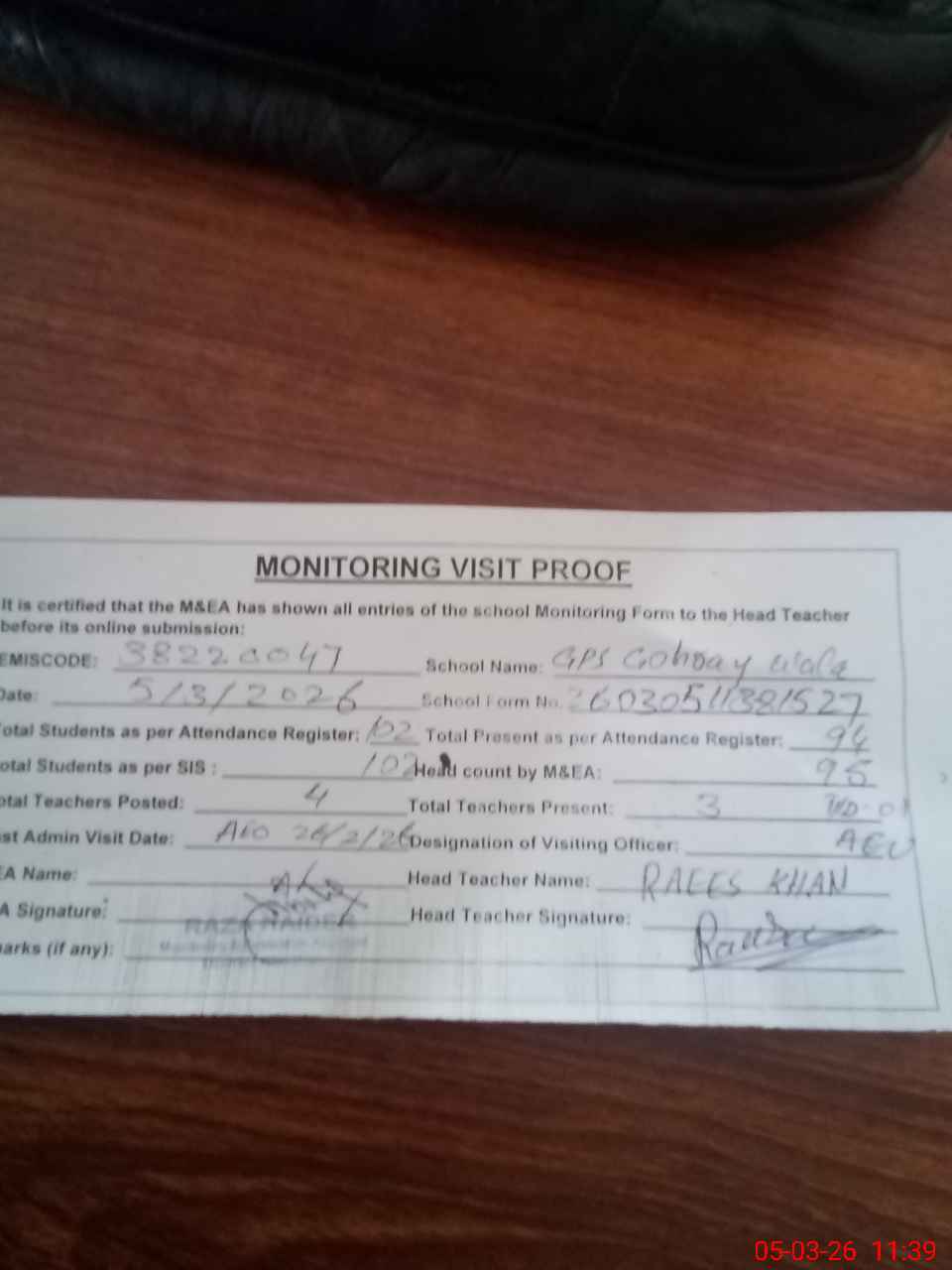 | Remarks (Use Separate Page if Required): AEO VISITED 26/2/26 DDEO VISTED 24/2/26 SIS. 102 | |||||