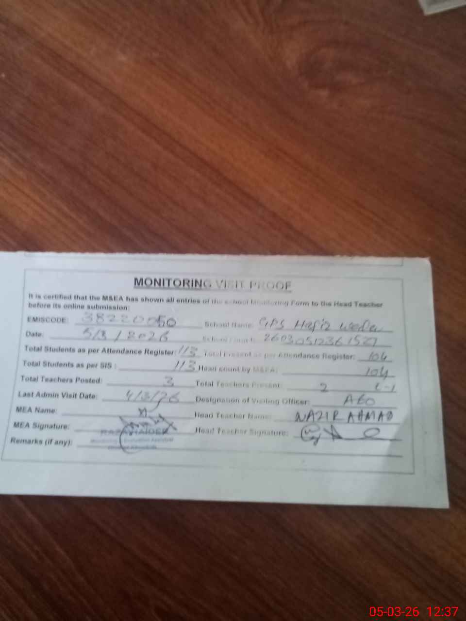 | Attendance Register | Head Teacher | MEA with School | Visit Proof |