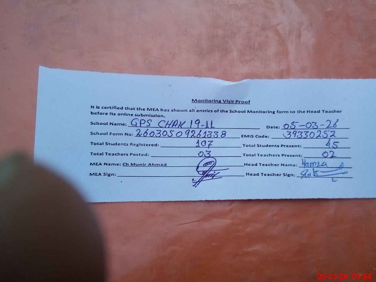 | Attendance Register | Head Teacher | MEA with School | Visit Proof |