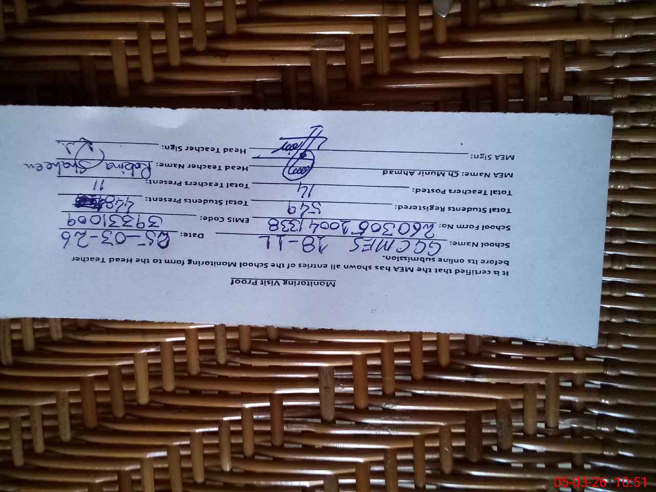 | Name: HU**** MA**** Designation: (School Headmaster's/Headmistress's) SST (SCI) Phone/Cell Number: 03**** |