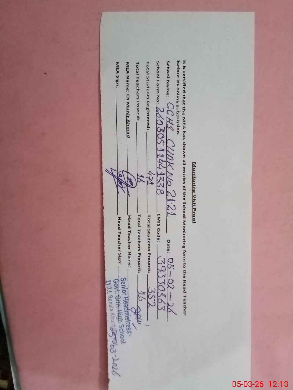 | Name: Za**** Pe**** Designation: (School Headmaster's/Headmistress's) HEADMISTRESS Phone/Cell Number: 03**** |