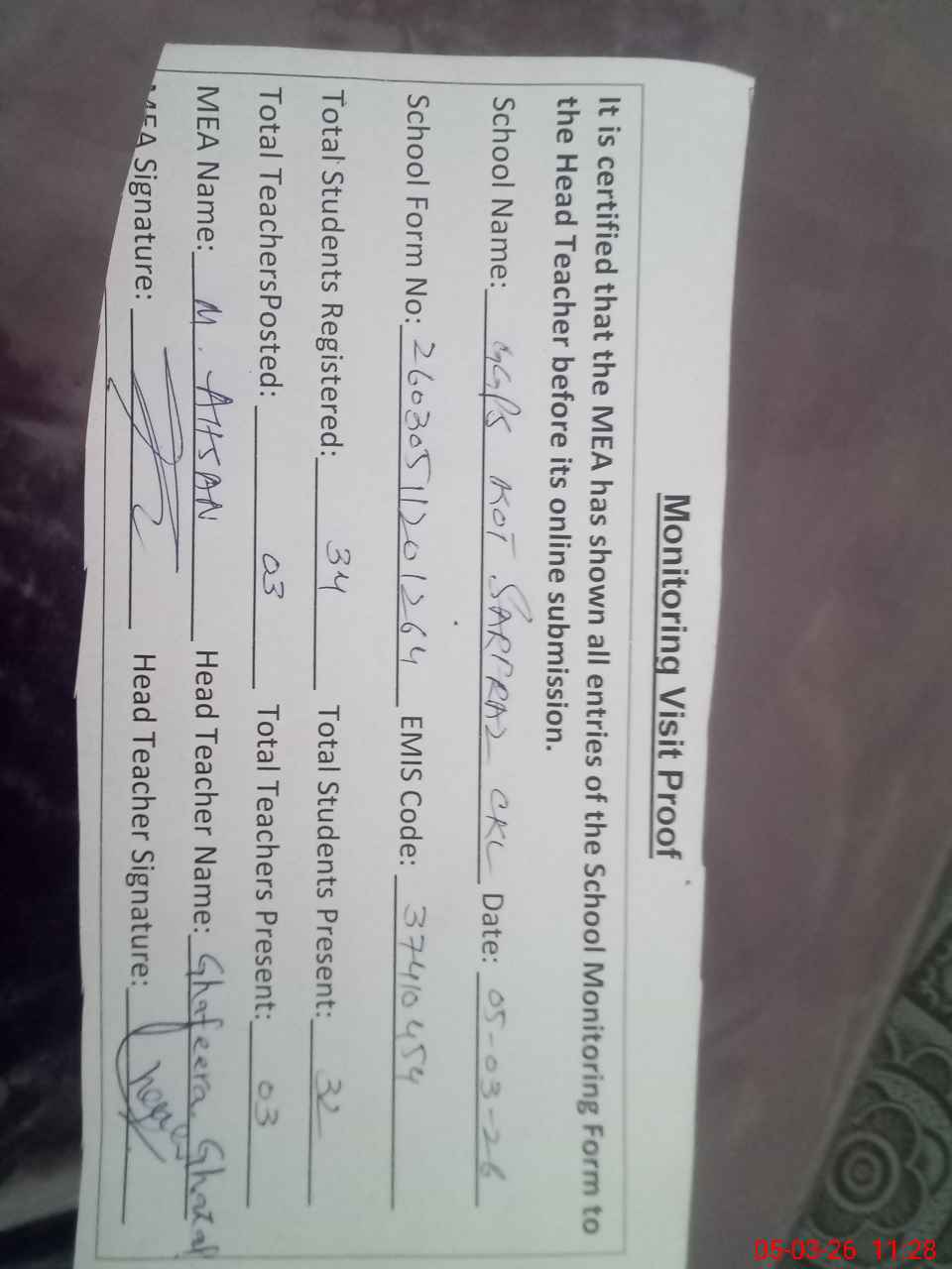 | Attendance Register | Head Teacher | MEA with School | Visit Proof |