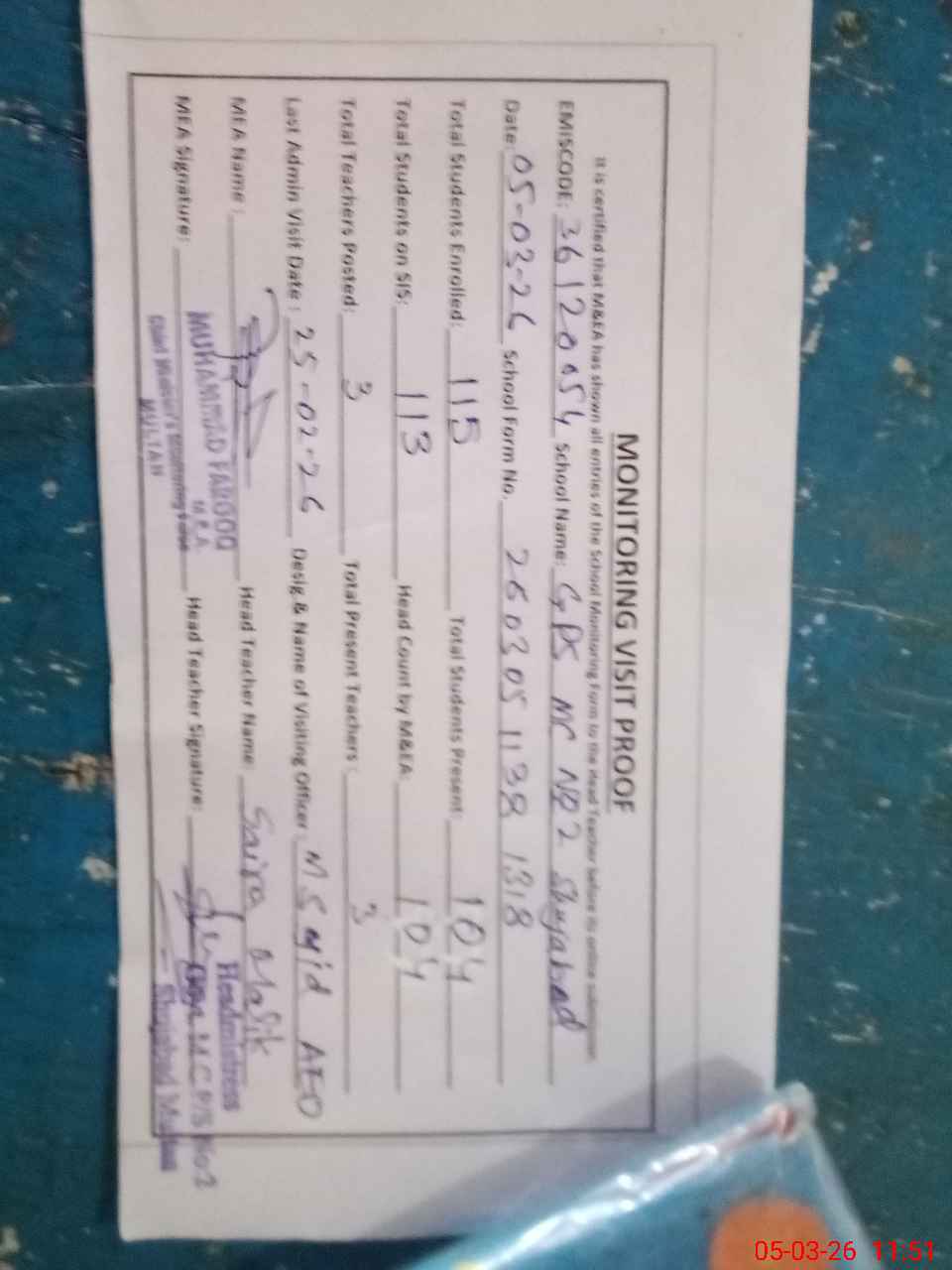 | Monitoring Date: 05-03-2026 | Start Time: 05-03-2026 11:14 AM | End Time: 05-03-2026 11:51 AM | Name of MEA: MU**** FA**** | |