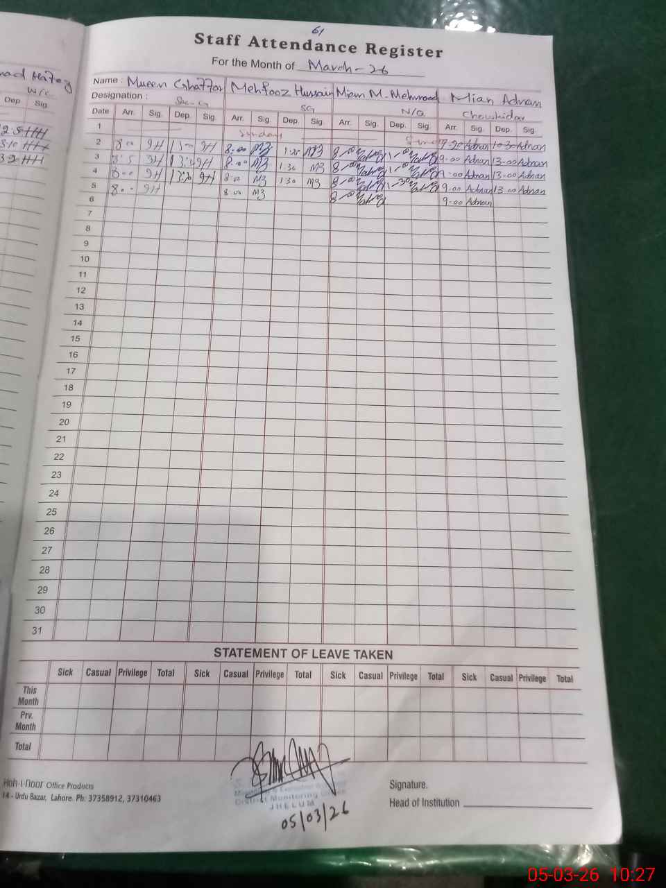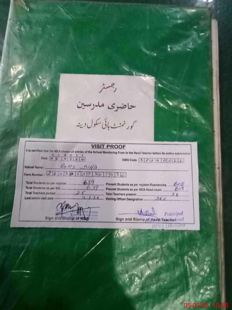 | Attendance Register | Head Teacher | MEA with School | Visit Proof |