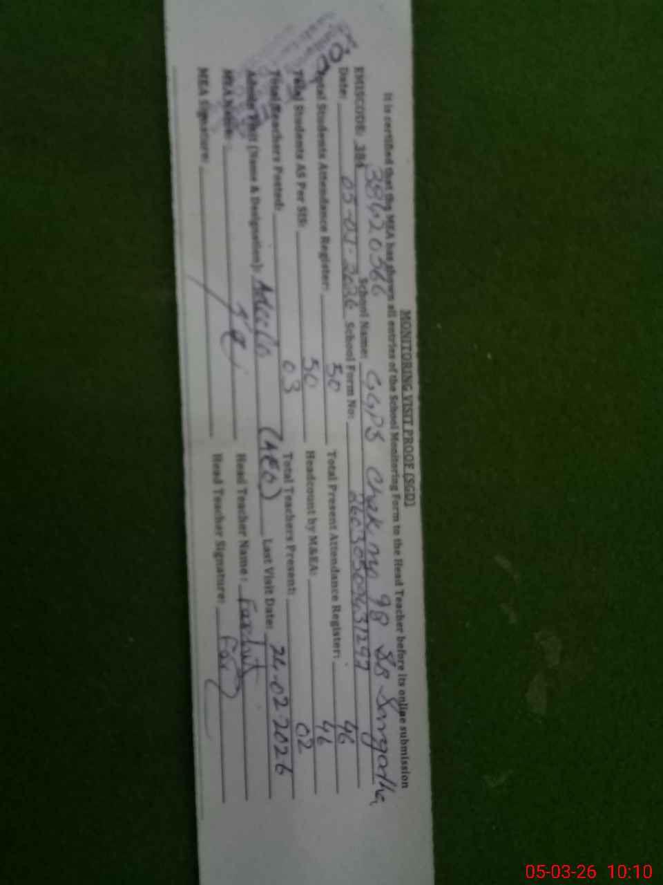 | Attendance Register | Head Teacher | MEA with School | Visit Proof |