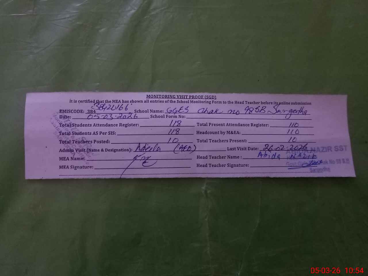 | Attendance Register | Head Teacher | MEA with School | Visit Proof |