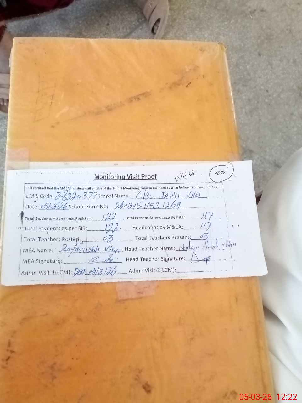 | Attendance Register | Head Teacher | MEA with School | Visit Proof |