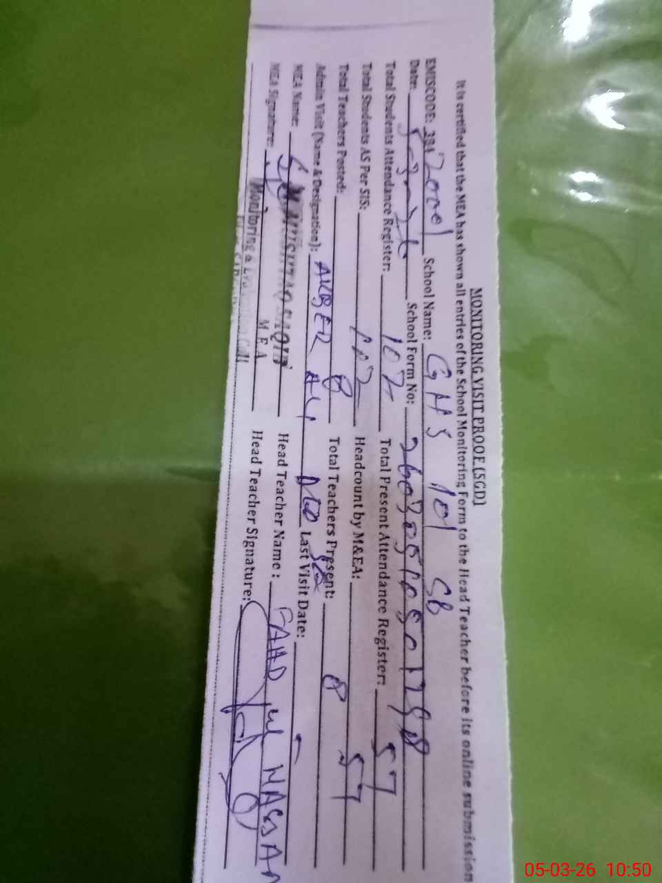 | Attendance Register | Head Teacher | MEA with School | Visit Proof |