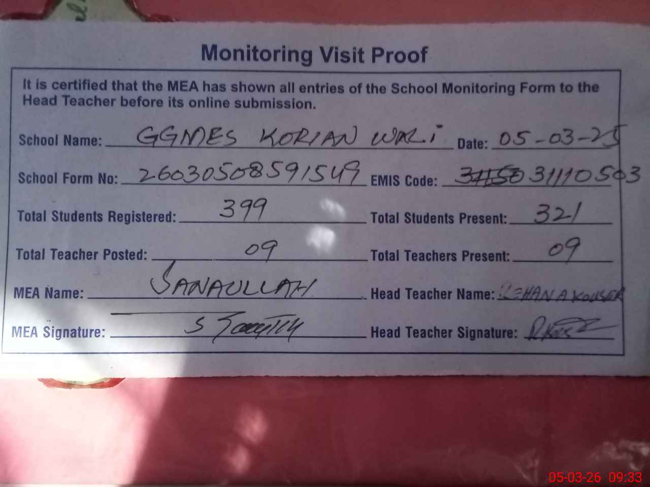 | Attendance Register | Head Teacher | MEA with School | Visit Proof |