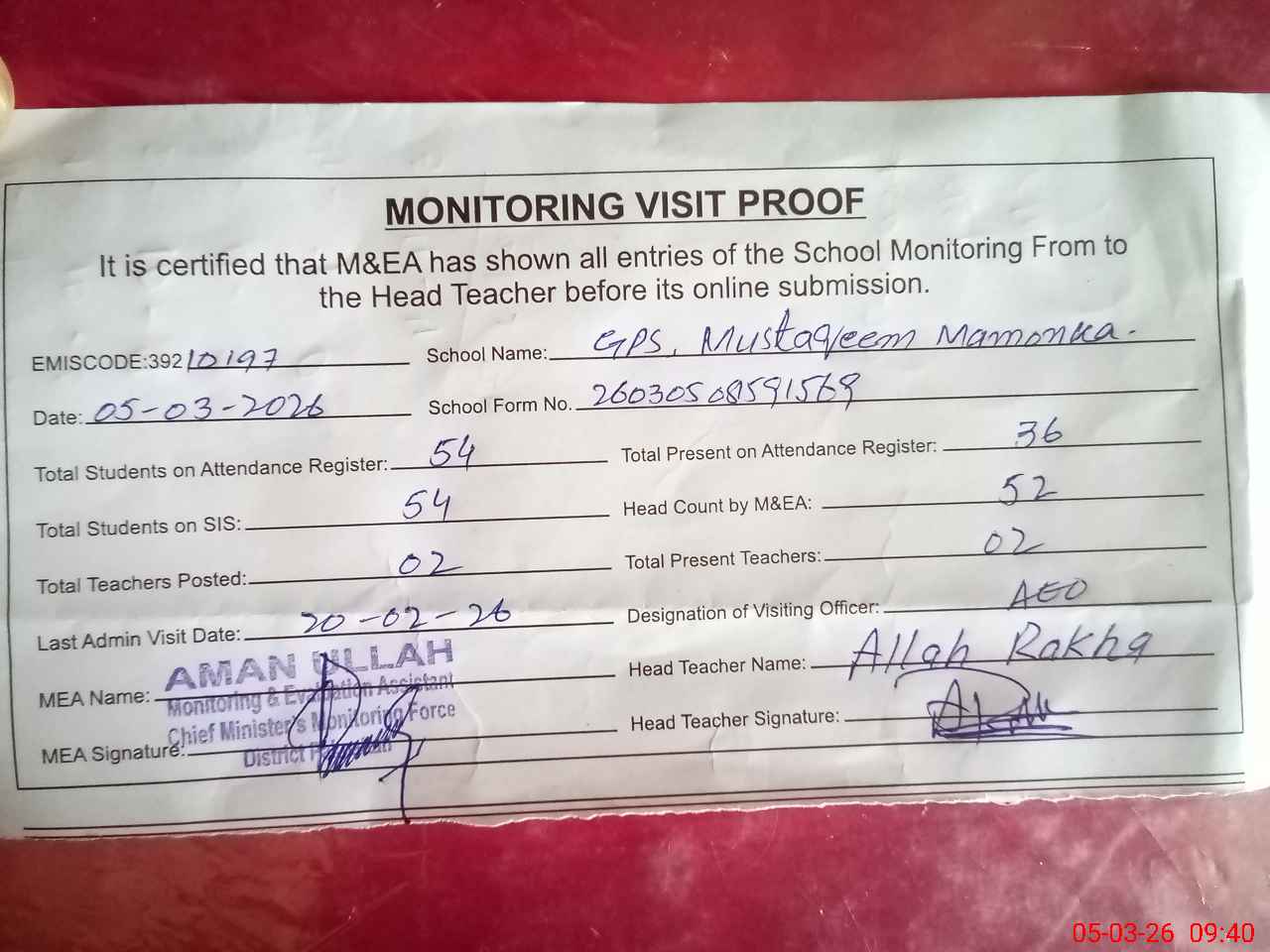 | Attendance Register | Head Teacher | MEA with School | Visit Proof |