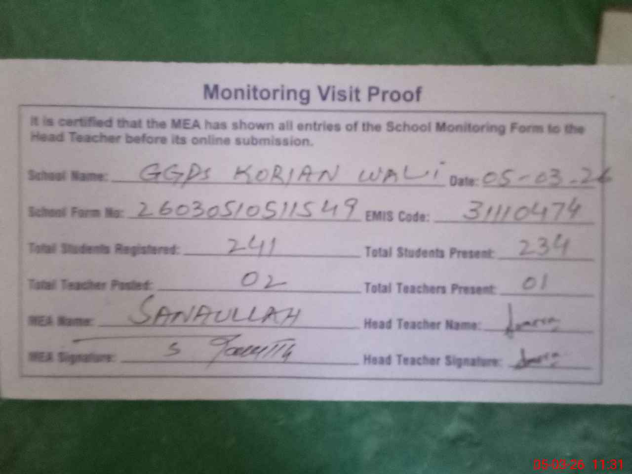 | EMIS Code: 31110474 | Name of School: GGPS KORIAN WALI NO 1 | |||