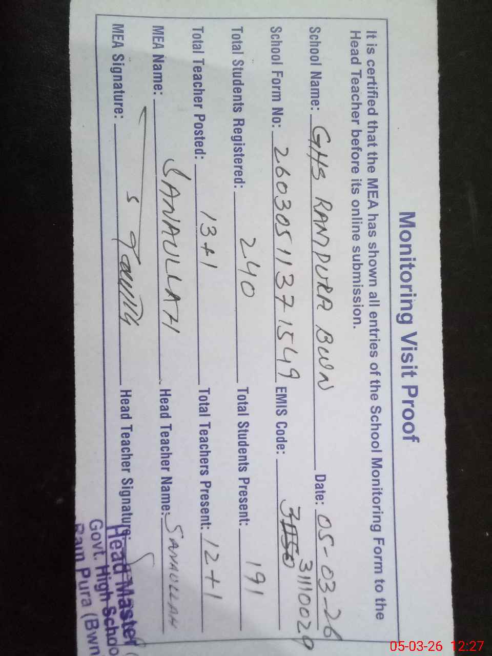 | Attendance Register | Head Teacher | MEA with School | Visit Proof |