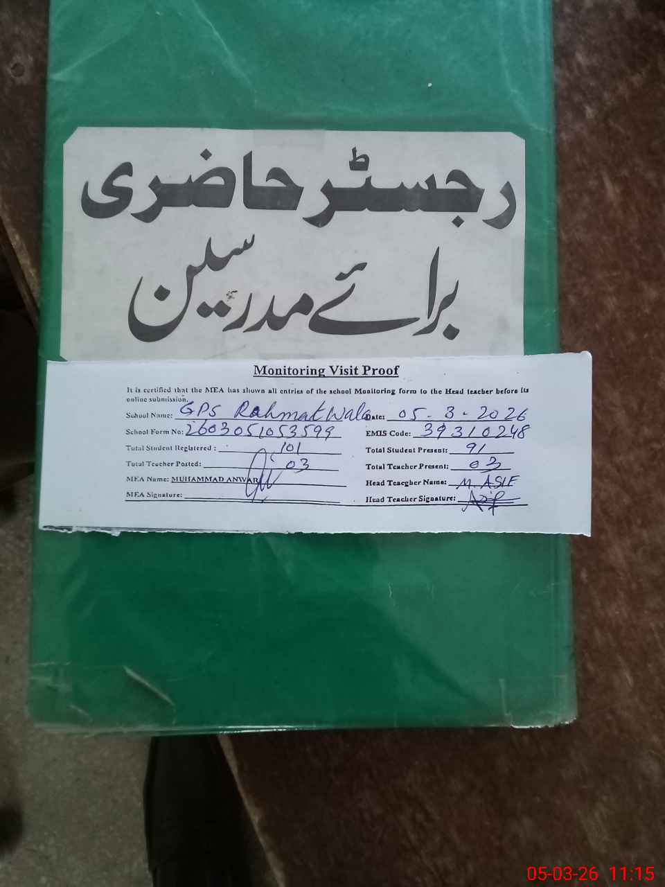| Attendance Register | Head Teacher | MEA with School | Visit Proof |