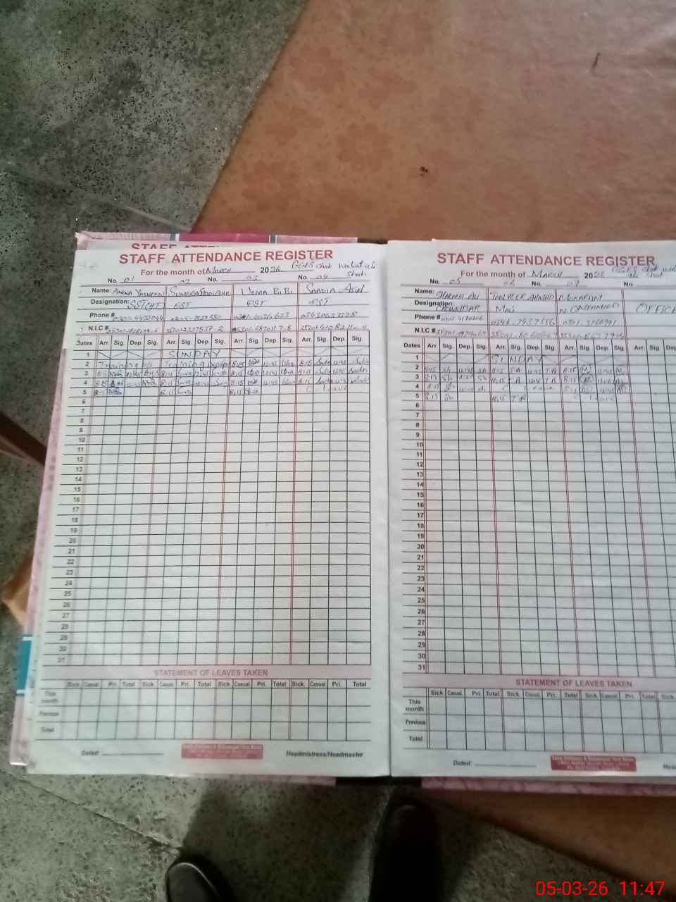 | CNIC | Full Name | Designation | R/C | Absence During Last Calender Month |