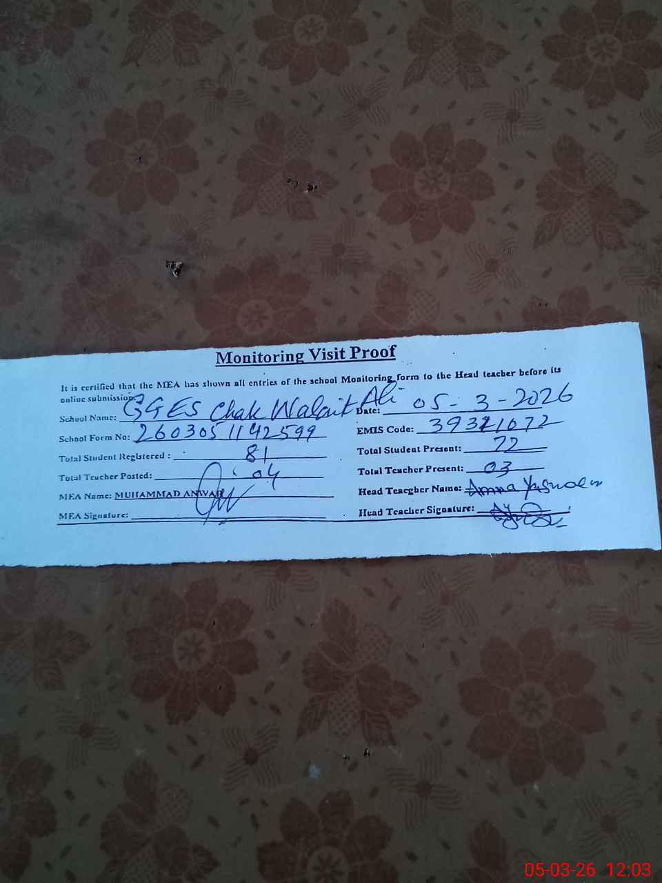 | Attendance Register | Head Teacher | MEA with School | Visit Proof |