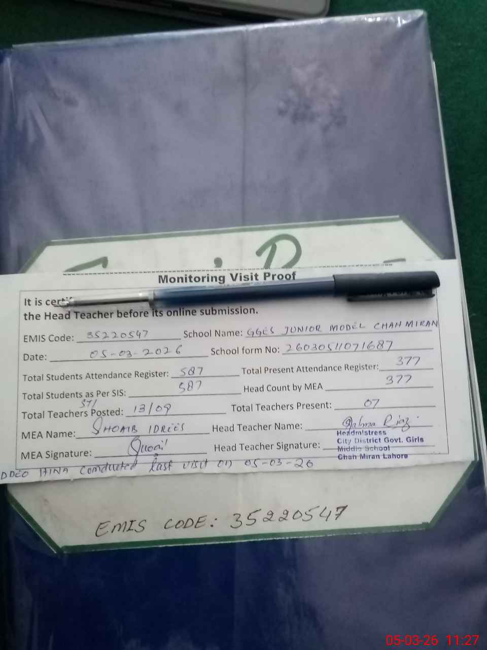 | Attendance Register | Head Teacher | MEA with School | Visit Proof |